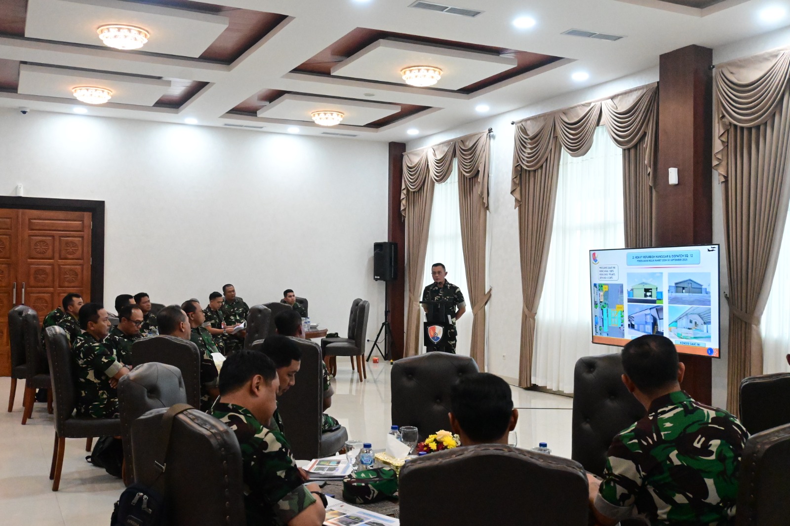 Mengawali rangkaian kegiatan, Kasau menerima paparan dari Danlanud di Ruang Bima, Gedung VIP Pandawa, terkait progres pembangunan fasilitas pendukung Rafale. Dalam paparannya, Danlanud memaparkan berbagai proyek penting yang sedang berlangsung, di antaranya pembangunan pilot building, hanggar Skadron Udara 12, area taxiway in/out, jet blast deflector, perluasan apron dan dispatch, serta pembangunan Rafale Training Center berikut Full Mission Simulator. “Alhamdulillah, hingga saat ini progres proyek infrastruktur Rafale berjalan positif, bahkan beberapa telah mencapai 100 persen dan siap uji fungsi,” ujar Danlanud penuh optimisme.