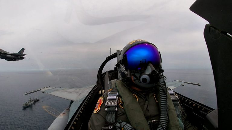 Dua Pesawat tempur F-16 dari Skadud 16 Wing 6 Lanud Roesmin Nurjadin mewakili TNI Angkatan Udara dengan dua pesawat Hawk-108